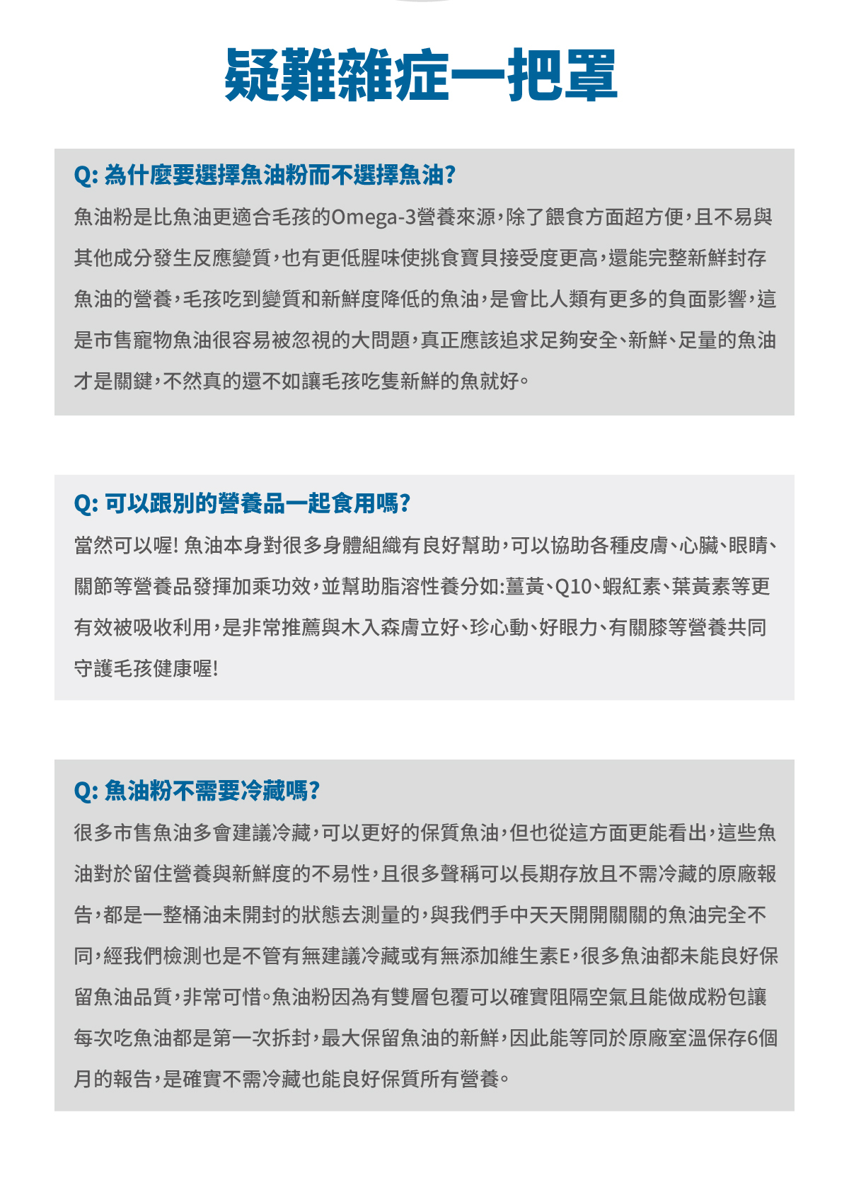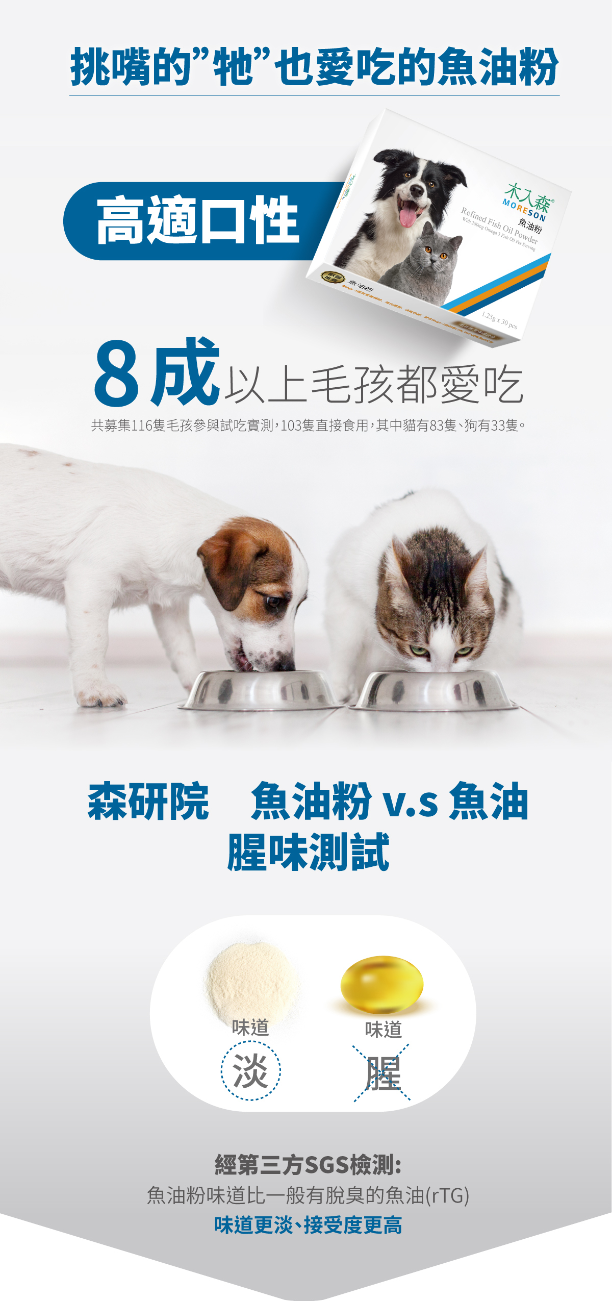 - 超高適口性,8 成以上貓咪狗狗也愛吃的「魚油」