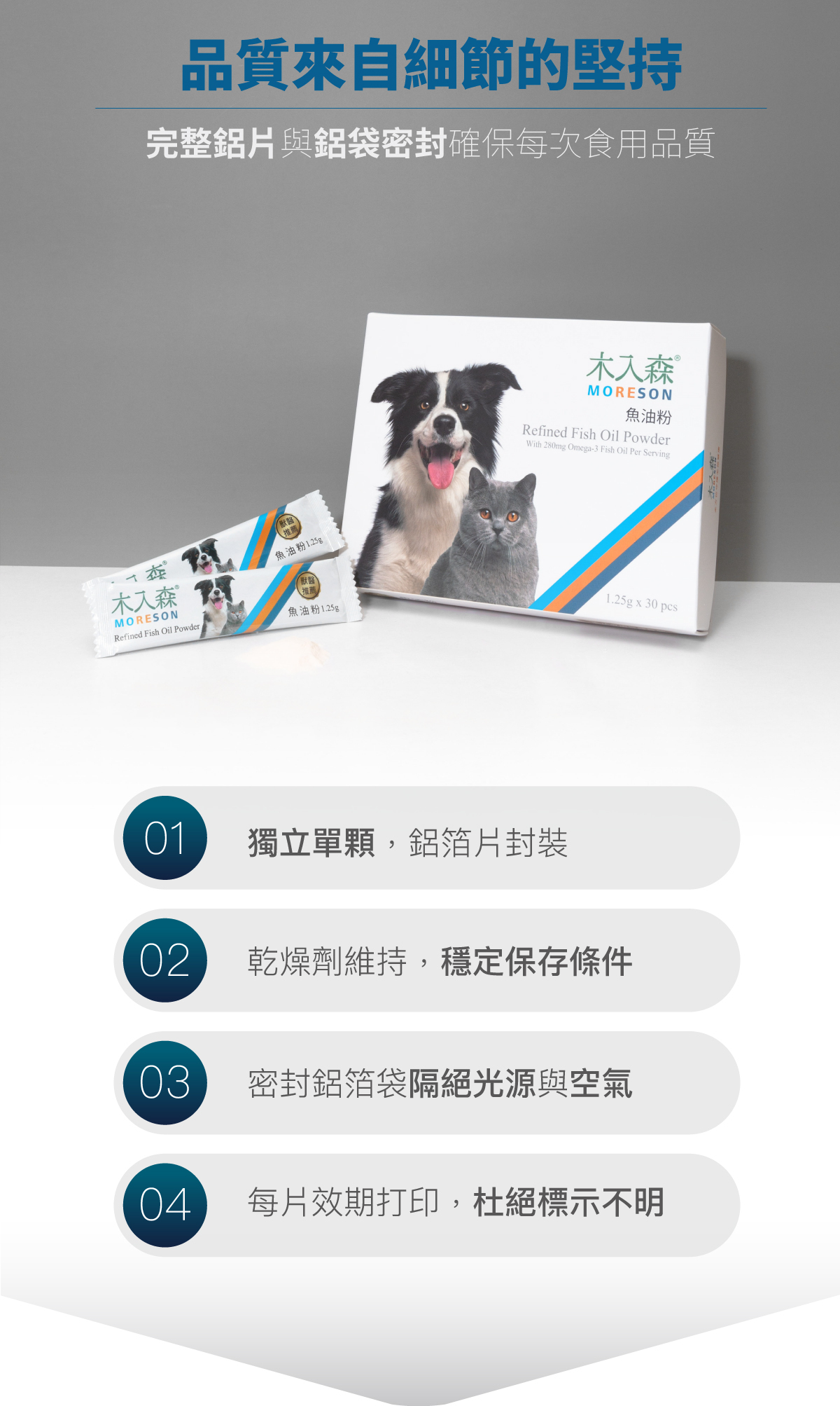 木入森魚油粉,有別於傳統魚油膠囊,是更適合貓咪狗狗的 Omega-3 營養來源,不只無腥味、適口性更高,餵食方便,專利「雙層包覆技術」還能完整新鮮保存魚油營養。