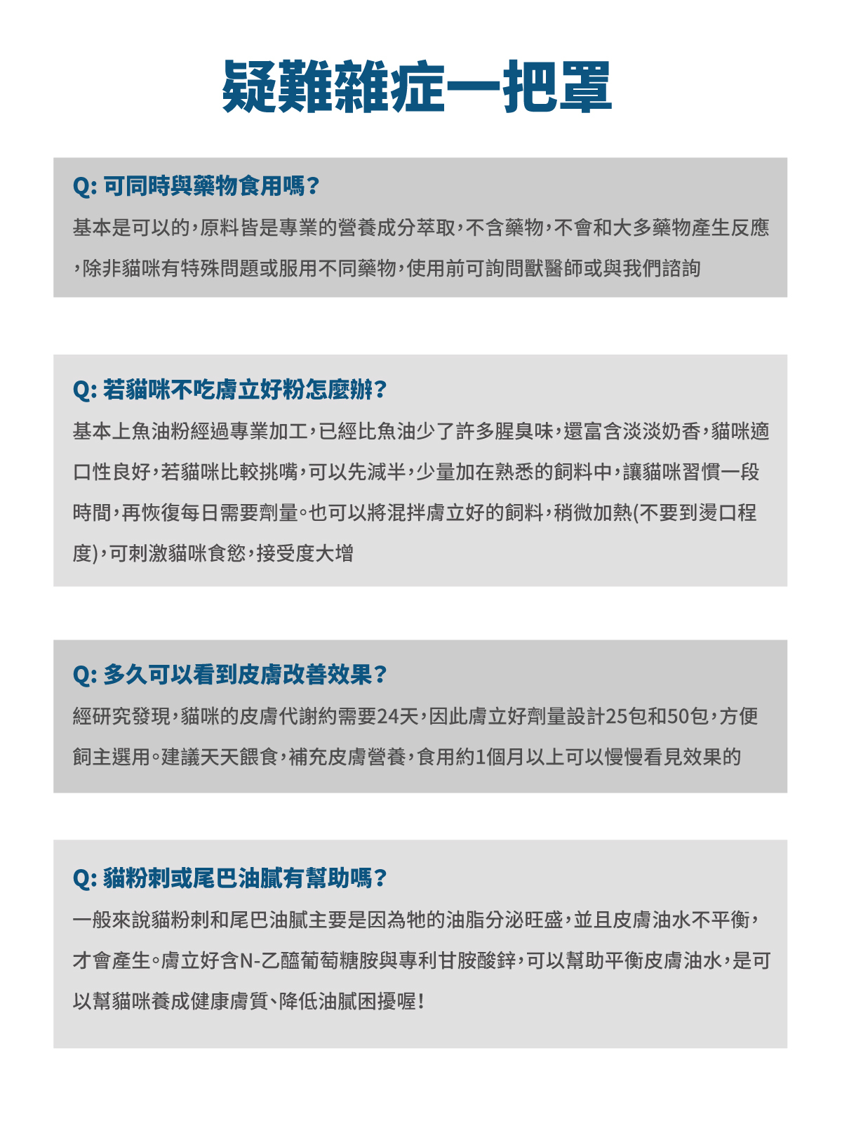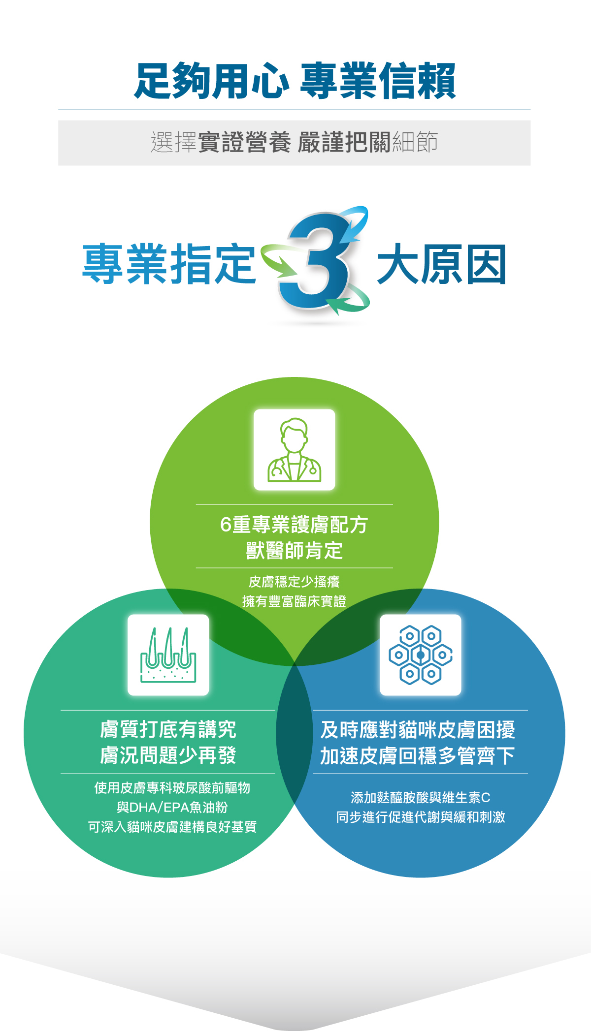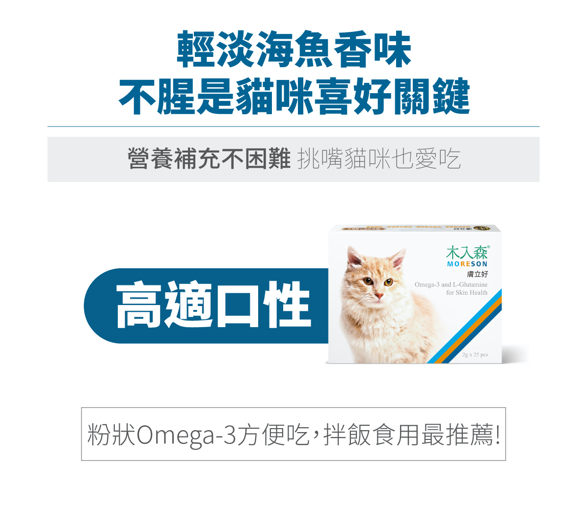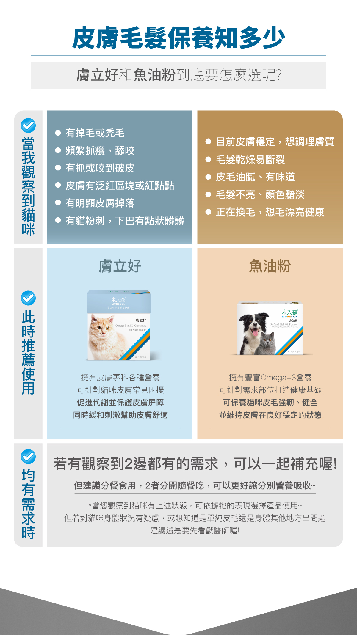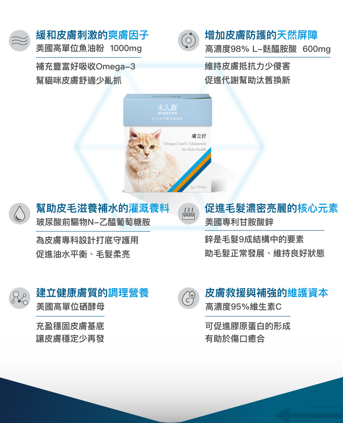 木入森貓咪膚立好,打造貓咪皮膚保健層層防護網,全方位營養搭配,緩解皮膚敏感,平衡皮脂分泌與皮膚乾燥,針對搔癢等皮膚刺激,維持皮膚正常功能。適合「需調理膚質,營養加強」、「正值皮膚問題困擾」的貓咪。